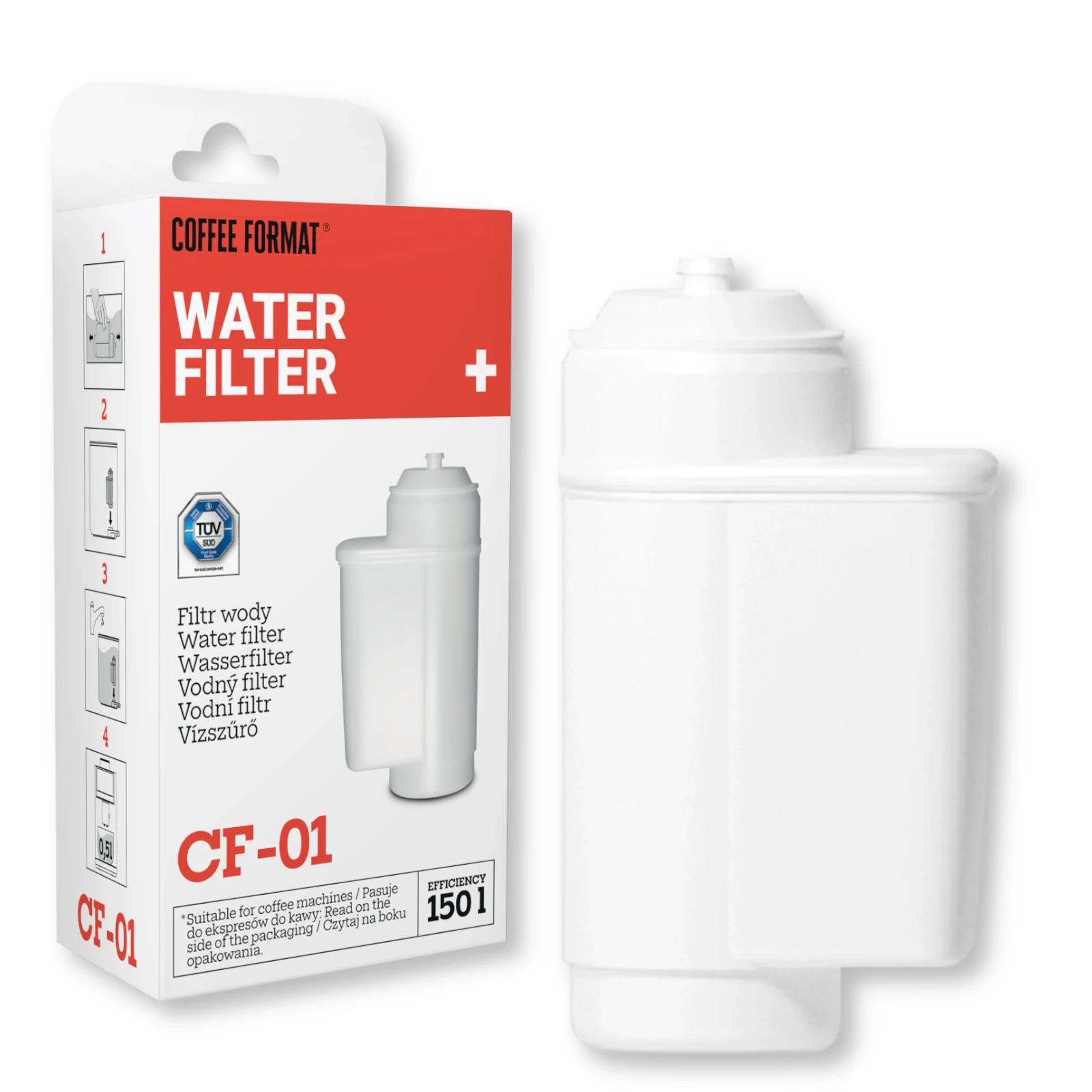 Częstotliwość wymiany filtra w ekspresie zależy od wielu czynników np. intensywności użytkowania, zanieczyszczenia wody oraz jakości złoża filtrującego. Filtr wody Coffee Format CF-01 charakteryzuje się zwiększona wydajnością filtracji wynoszącą do 150 litrów wody! Wydajność większości wkładów filtrujących dostępnych na rynku wynosi zaledwie 50 litrów. Filtr Coffee Format umożliwia przefiltrowanie 3 razy większej ilości wody!